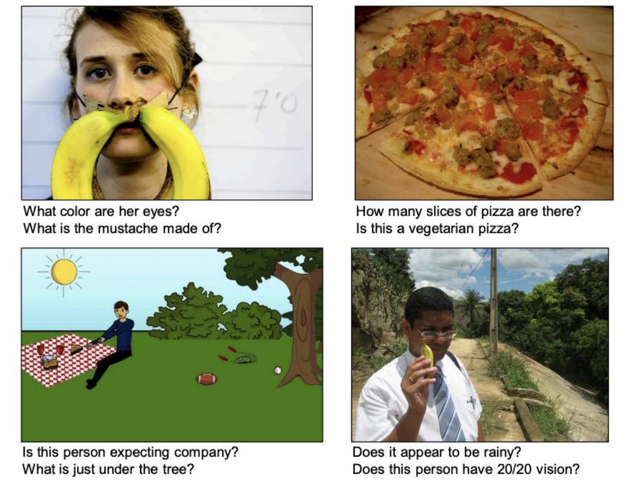 Examples from the VQA dataset. Image credits: Agrawal, A., 2019. Visual question answering and beyond. PhD Dissertation. Georgia Institute of Technology.