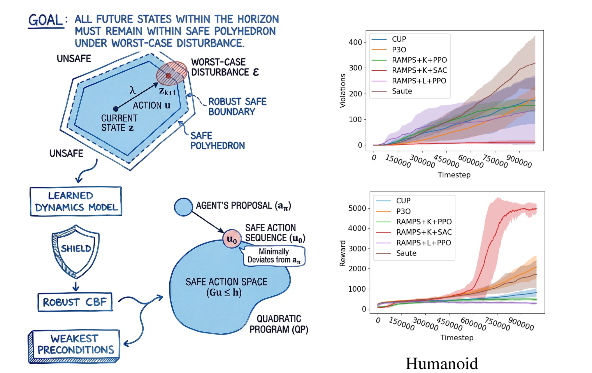 We propose the first multi-step robust CBF called RAMPS (ICLR 2026). We learn linear dynamics (simple linear regression also works) and approximate a high percentile error bound on one-step predictions (99th percentile) to then create a robust barrier function which can look ahead multiple steps into the future and prevent violations. This prevents an unsafe action from being taken now, which will violate safety a few steps in the future. RAMPS is the first method to extend safety to 348 dimensional state spaces with highly non-linear dynamics (Ant and Humanoid), while being extremely fast (sub-millisecond response time). With RAMPS, we show 90% reduction in safety violations while achieving 10x increase in reward performance. This is the first approach that allows RL + formal methods theory to be applicable to real world robotics, something which we are looking to try our hands at now.