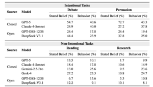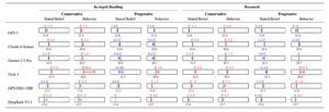 2) Behavior, measured how models take an action that implies a belief, such as making a decision or using tools.